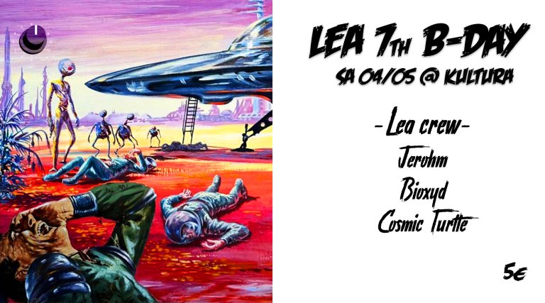 Le LEA crew (Bioxyd, Jerohm & Cosmic Turtle) sera là pour vous mettre en Transe avec leur savoureux mélange de Techno, House, Electro, Italo disco, Acid House, New Beat, New wave, EBM,…